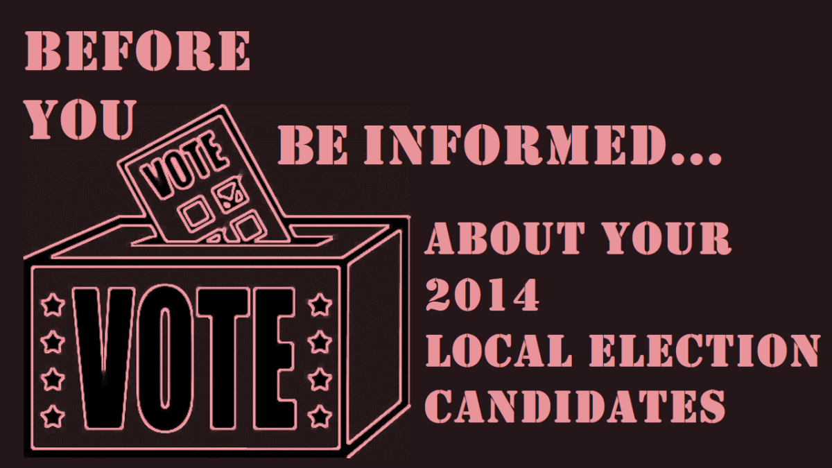 before you vote May6 Published at 1280 × 720 in BE INFORMED…About your 2014 Local Election Candidates ← Previous Next → Share this: Share on X (Opens in new window) X Share on Facebook (Opens in new window) Facebook Share on LinkedIn (Opens in new window) LinkedIn Email a link to a friend (Opens in new window) Email Like Loading...
